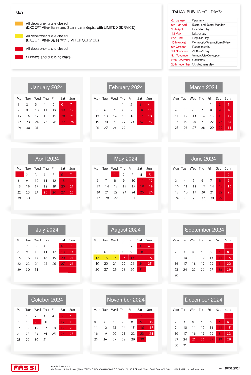 Fassi Gru S.p.A. will be closed on the following days: