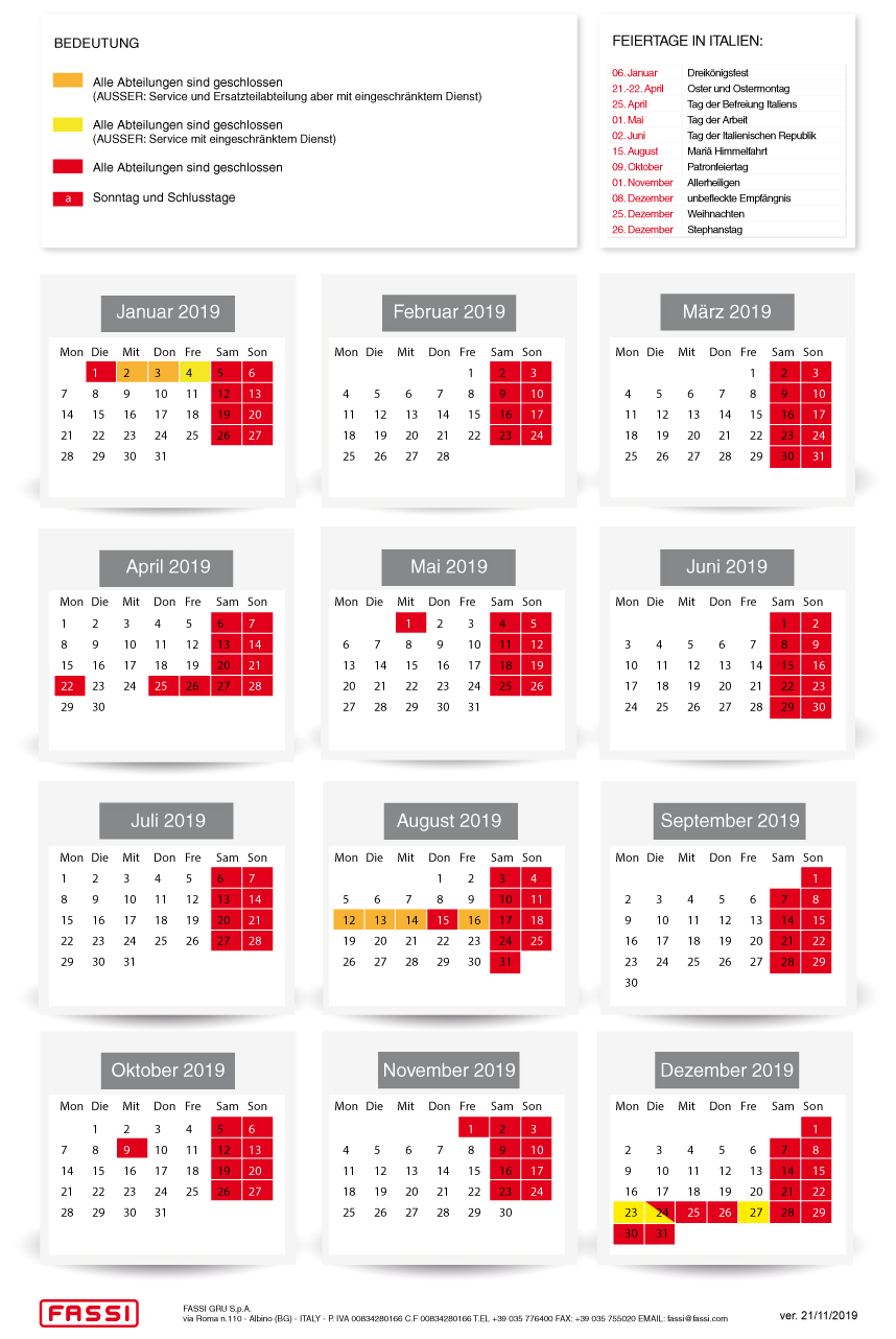Fassi Gru S.p.A. wird an folgenden Tagen geschlossen bleiben: