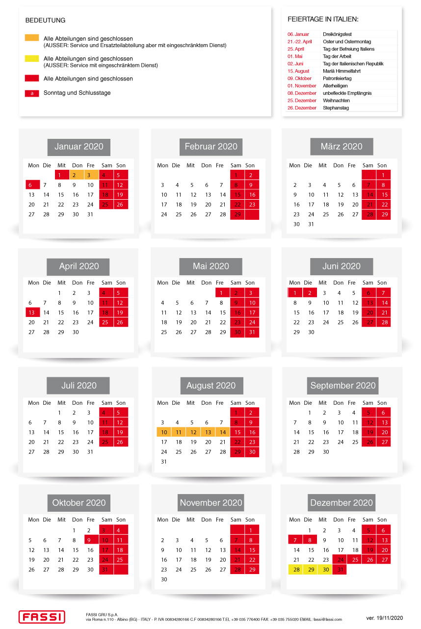 Fassi Gru S.p.A. wird an folgenden Tagen geschlossen bleiben: