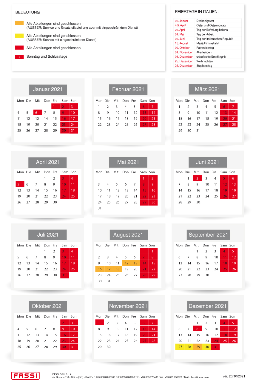 Fassi Gru S.p.A. wird an folgenden Tagen geschlossen bleiben: