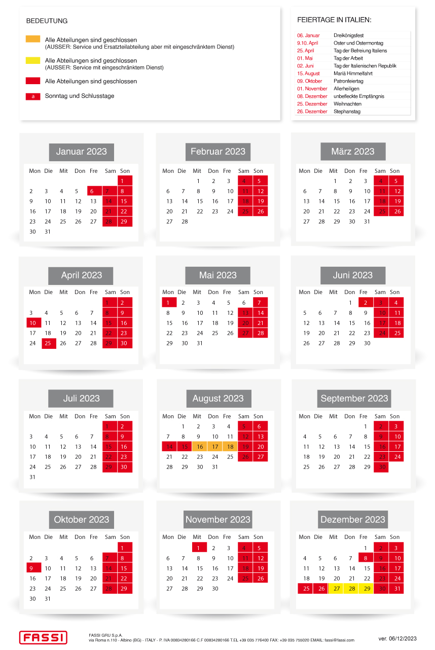Fassi Gru S.p.A. wird an folgenden Tagen geschlossen bleiben: