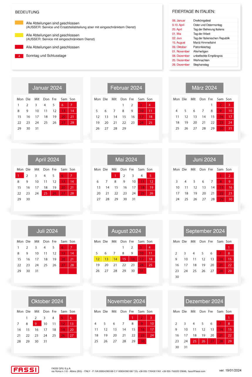 Fassi Gru S.p.A. wird an folgenden Tagen geschlossen bleiben: