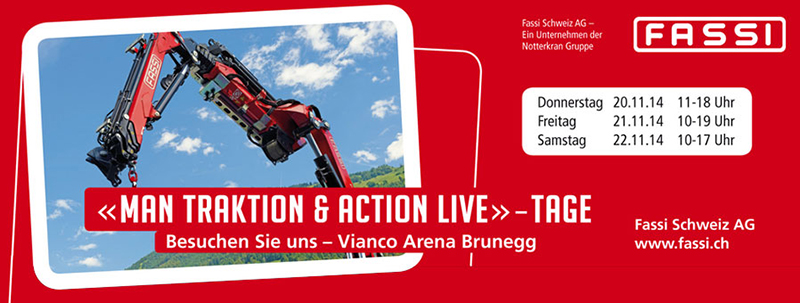 Fassi Traktion and Action live Brunegg (in der Schweiz): Von 20.  bis zum 22. November teilt Fassi Schweiz am Ereignis "MAN Traktion & Action live!", das an der Vianco Arena Brunegg (40 km westlich von Zürich) stattfindet. Für drei Tagen ist es möglich, auf dem Teststrecke die LKW MAN zu fahren sowie einige interessante Produkte zu sehen, wie die Krane Fassi.