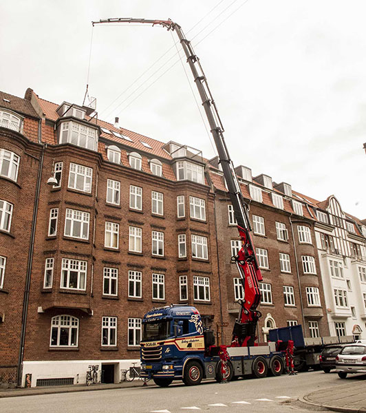 Fassi F1950RAL - Casper AndersenWir befinden uns im dänischen Städtchen Arhus und der mit dem neuen F1950RAL Fassi Kran ausgestattete R490 Scania der Firma Erling Andersen ist gerade im Begriff über ein sechsstöckiges Haus zwei Balkone zu installieren, die an der hofseitigen Fassade befestigt werden sollen.
