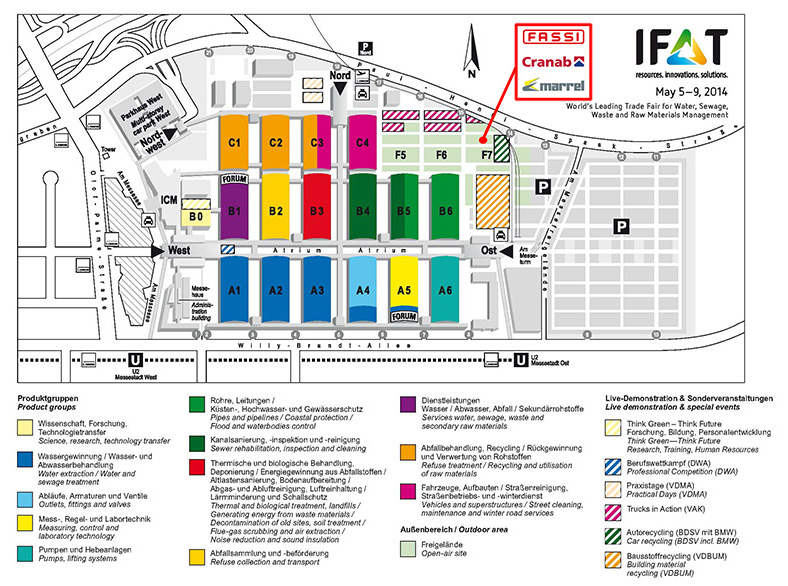 Fassi stand IFAT 2014Fassi Gru, ein weltweit führendes Unternehmen in der Hebebranche, wird zum ersten Mal auf der IFAT, der wichtigsten internationalen Ausstellung der Recyclingbranche, die von 05. bis 09. Mai in München stattfindet, selbst ausstellen. Der 196 m2 große Messestand der Gruppe Fassi wird sich im Freigelände F7, Stand 714/4, befinden. Anlässlich dieser wichtigen Veranstaltung wird sich Fassi Gru S.p.A. zum ersten Mal, gemeinsam mit Cranab AB und Marrel S.A.S., dem Markt präsentieren.