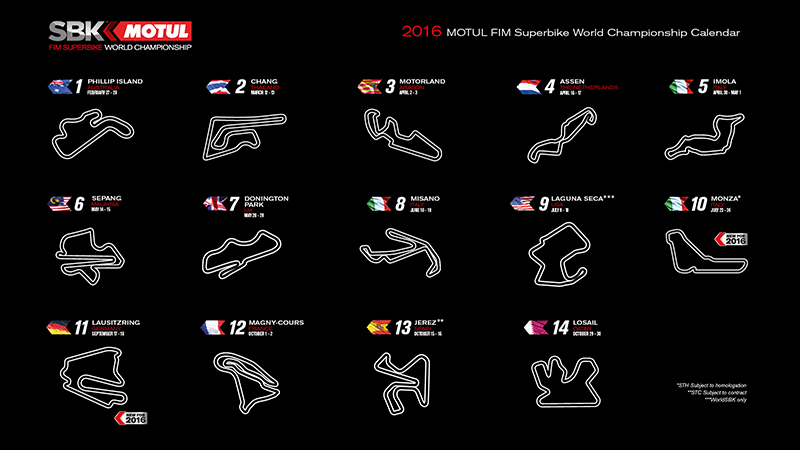 Die Meisterschaft sieht in der kommenden Saison etwas anders aus. Mit ihren neuen Regeln wird die FIM Supersport World Championship (WorldSSP) fast alle Runden an der der Seite der Motul FIM Superbike World Championship (WorldSBK) fahren. Erneut wird auch der FIM Superstock 1000 Cup (STK1000) an allen europäischen Rennwochenenden in der Saison starten.Der Motul FIM Superbike World Championship Kalender 2016 sieht wie folgt aus: