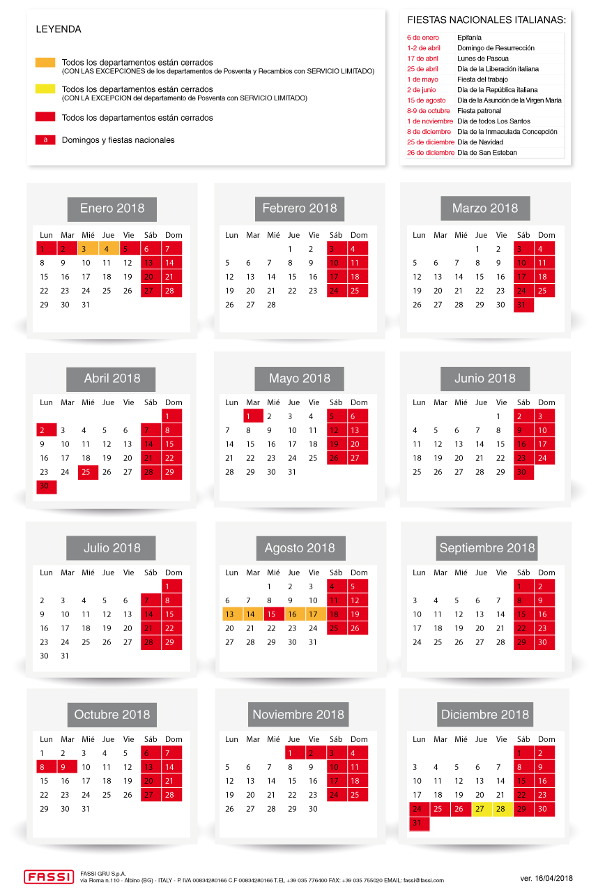 Fassi Gru S.p.A. permanecerá cerrada los siguientes días: