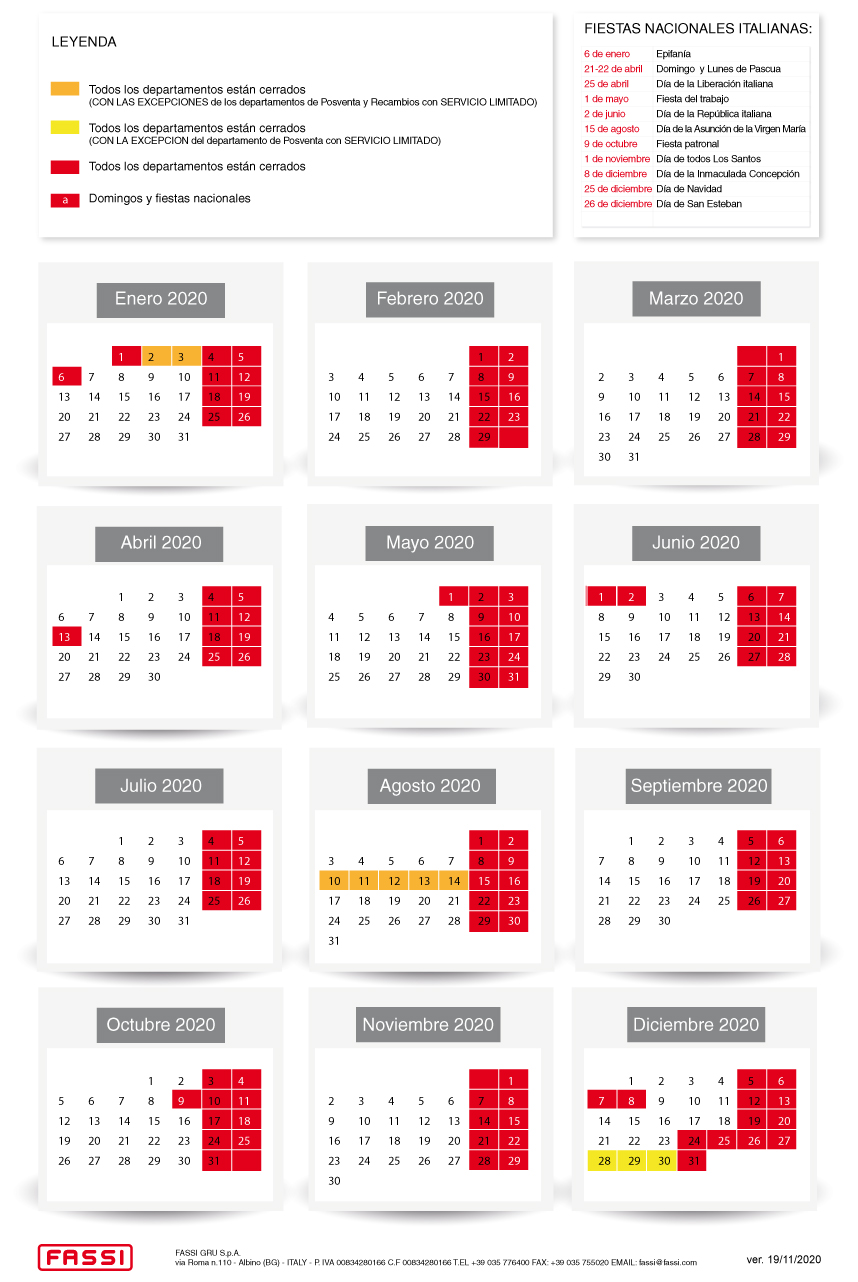 Fassi Gru S.p.A. permanecerá cerrada los siguientes días: