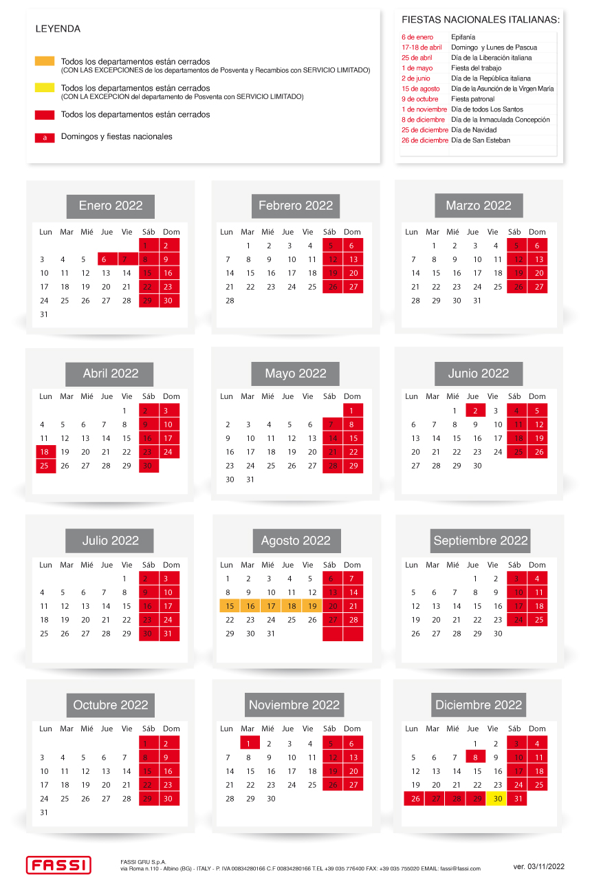 Fassi Gru S.p.A. permanecerá cerrada los siguientes días: