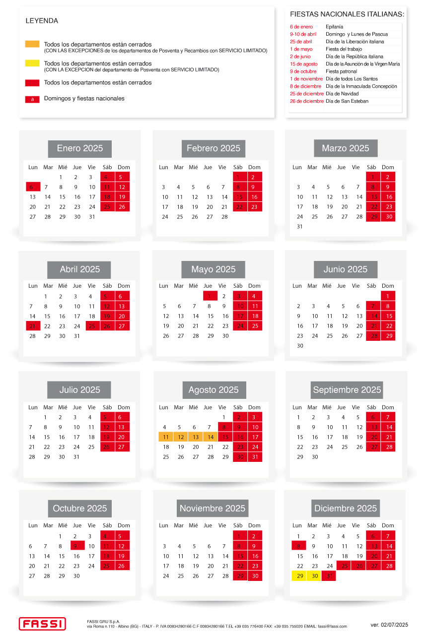 Fassi Gru S.p.A. permanecerá cerrada los siguientes días: