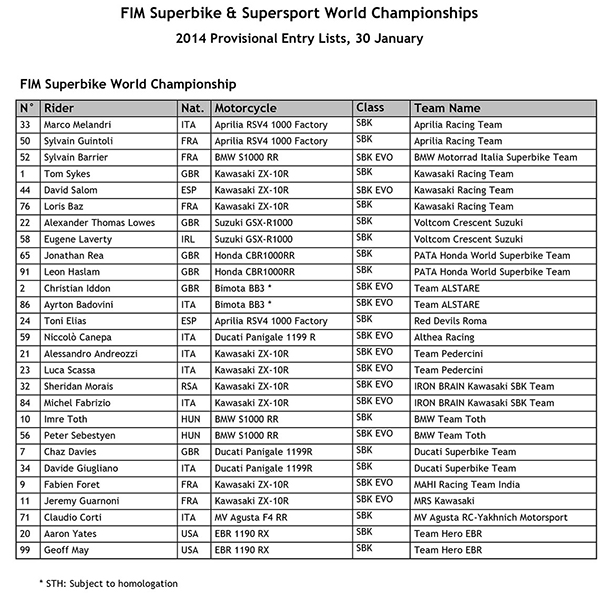 Here is the Provisional entry list of the drivers for the 2014 Superbike World Championship. The 2014 Championship will start with the Australia race at Phillip Island on February 23rd