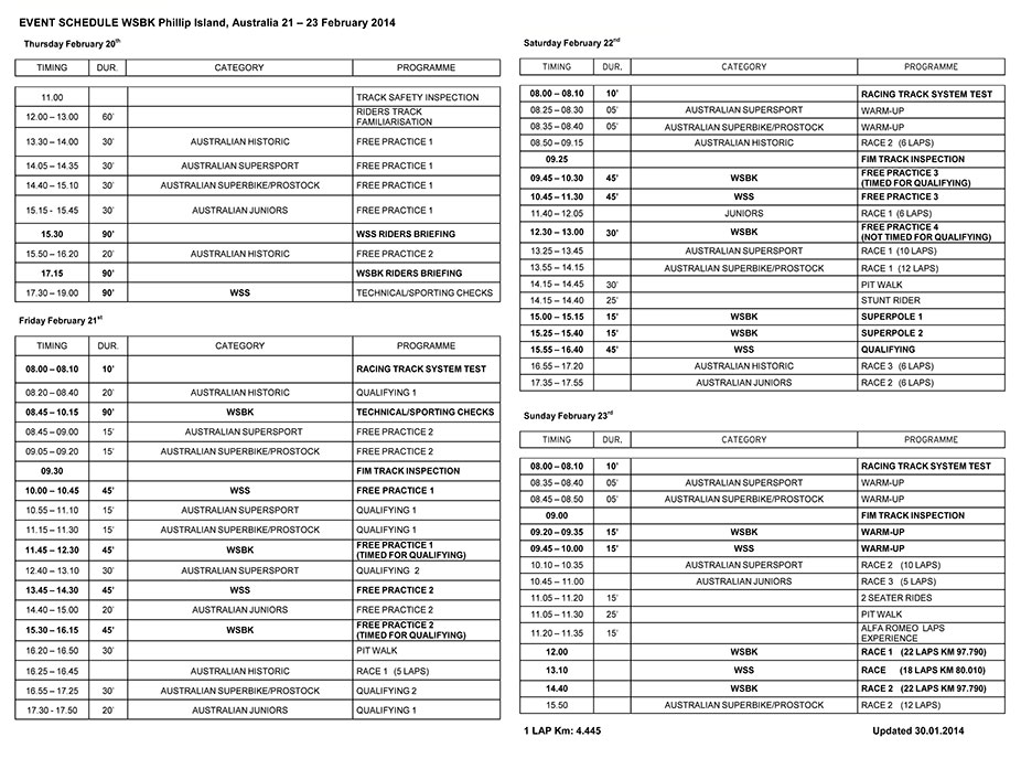 The Event Schedule for the Superbike World Championship Round 01 at Phillip Island, Australia - 21, 22, 23 February 2014. Click on the Fassi-SBK logo to see the program.