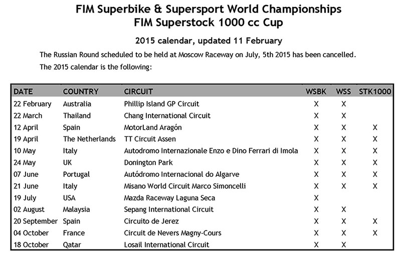 Wednesday 11th February 2015 - Dorna WSBK Organization and the FIM, Fédération Internationale de Motocyclisme, regret to inform of the cancellation of the Russian Round scheduled to be held at Moscow Raceway on July 5th 2015.