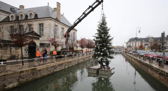 Des sapins installés sur les quais de Seine à Troyes grâce à une grue Fassi