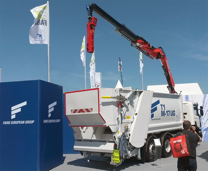 Fassi F165A ScaniaLe concessionnaire français Forez Bennes de Lyon, appartenant au réseau de notre importateur français MILTRA, a mis en place avec la collaboration  de Scania un véhicule de démonstration exposé sur le stand du groupe européen Farid durant la dernière foire IFAT à Munich. Le véhicule en plus du  compacteur est configuré avec une grue Fassi F165A.2.23 e-dynamique équipée d'accessoires spéciaux pour le levage de containers de matériel  recyclable.