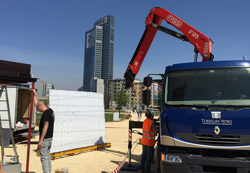 Fassi at Expo Milano Milano - Aprile 2015. Una gru Fassi di 13 t/m allestita su un mezzo della ditta Torsellini Vetro Srl di Gavirate (provincia di Varese) ha lavorato a metà mese nell'area dell'Expo 2015 movimentando lastre di vetro installate in uno dei padiglioni dell'esposizione universale che si inaugurerà a Milano il 1 di maggio.