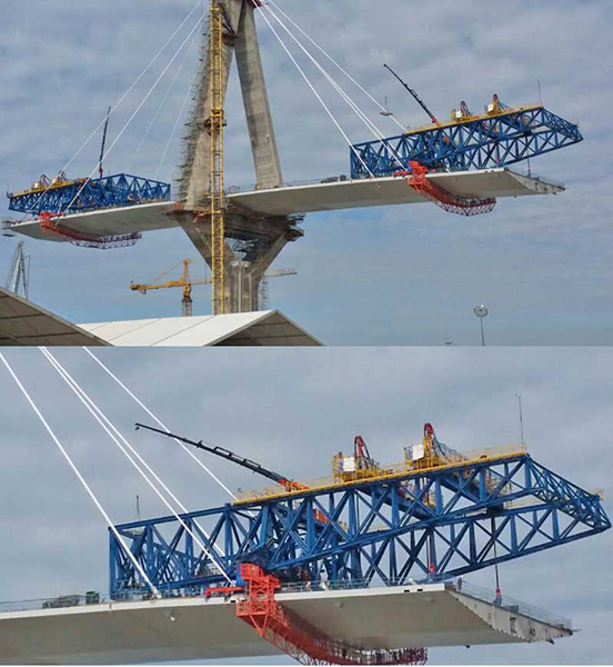 Due delle quattro gru Fassi F1100RA.2.28 he-dynamic al lavoro sul nuovo ponte a Cadice
