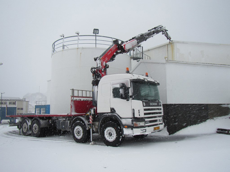 Iceland Fassi February 2015 - Vestman islands (150 km southeast of Reykjavik). A Fassi F455A.2.26 hydraulic crane with L214 jib, is working at the Vestman islands in severe atmospheric conditions. 48 m/sec wind average and a snow storm make it difficult even the easiest of operations: the material handling on the roof of a building. Courtesy of Barki.Ehf.