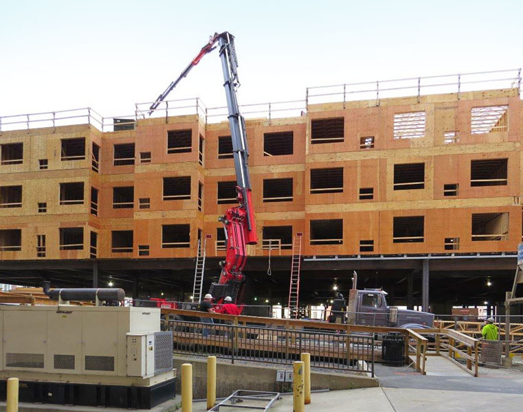 Fassi F1950RAL - Fascan Pennsylvania (U.S.) - December 2014. The Fassi F1950RAL crane with the L816L jib is a perfect solution on construction sites when it's necessary to move bulky materials or to reach tight spaces. In the picture the crane is working bringing material on the roof of the building.