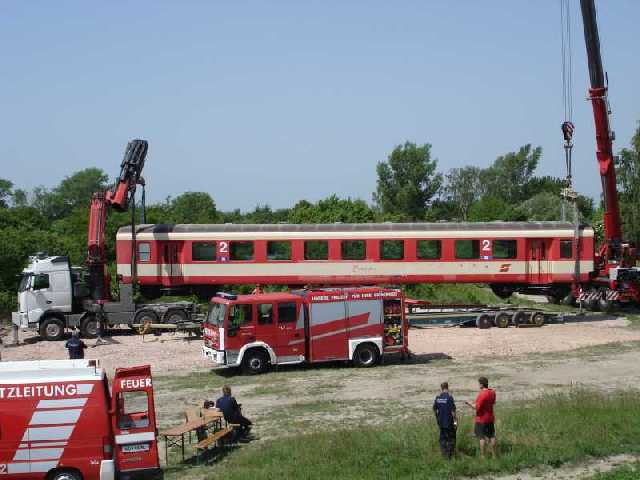Fassi Stockerau Stockerau Railway Station (28 km north of Vienna/Austria) - The handling of the transport of a railway wagon has been resolved thanks to the intervention of a Fassi crane of 110 t/m and of a telescopic booms crane. The truck with the Fassi knuckle boom crane has also pulled the trailer for special transport upon which the railroad wagon was transported.