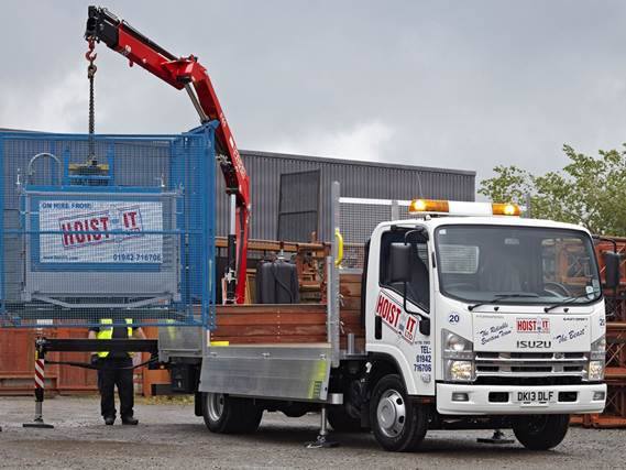 A 7.5t Isuzu truck with an articulated crane Fassi model F65A rear mounted