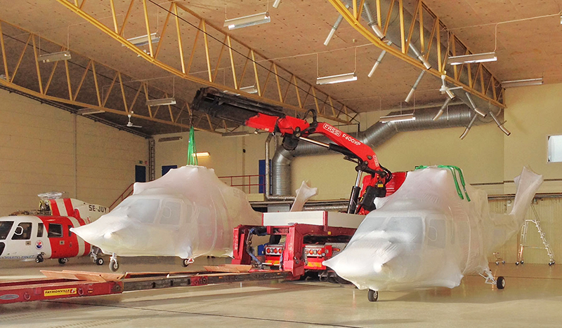 A Fassi heavy-duty crane of 60 tm is been involved into handling and transport of two helicopters near Göteborg (Sweden)