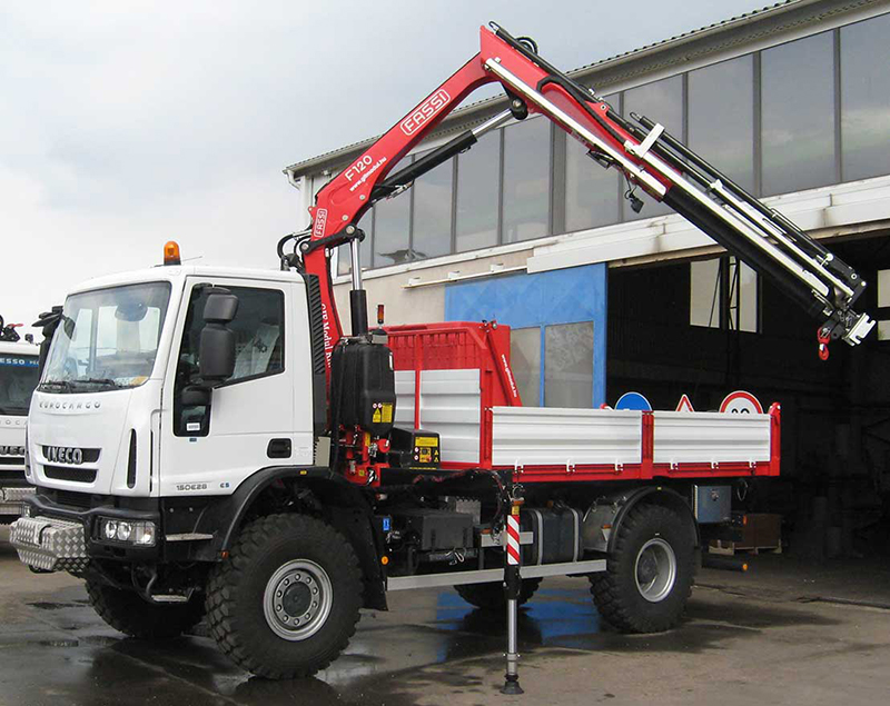 Fassi F120BThe hungarian dealer of Fassi – GIF Modul Kft. – has installed 3 pcs Fassi F120B.2.23 e-dynamic crane on 15 ton IVECO Eurocargo 4x4. The truck will be used by an electricity network builder company - EH-SZER Kft. (member of E.ON Group in Hungary) – for building and maintenance works. The main purpose was to make a double axles truck which has good off-road ability with the maximum lifting capacity.
