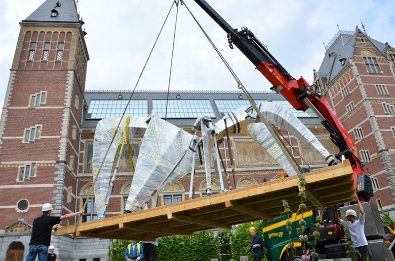 Fassi CalderAmsterdam (Nederland) - Thursday 22 May 2014. In June, an exhibition of sculpture opens in the gardens of the Rijksmuseum in Amsterdam. Well 14  giant sculptures of the famous American artist Alexander Calder (1898-1976) will be transferred to Amsterdam. Yesterday the first masterpiece was placed with a Fassi crane: a giant anteater.