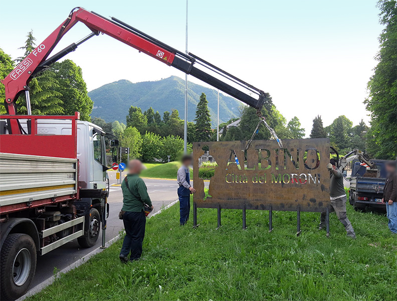 A Fassi crane to place Moroni's sign in AlbinoAlbino (13 km north-east from Bergamo/Italy), Thursday 15 May 2014 - The municipality of Albino to remember the origins of the Lombard famous mannerist painter, Giovan Battista Moroni, has placed a sign at the entrance of the town to witness this important cultural value. A crane Fassi of 6 tons was used to complete this job.