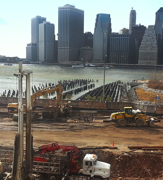 Fassi knuckle boom crane F530XP at New YorkMarch, 28th - New York, a Fassi knuckle boom crane 50 t into a construction site close to a Brooklyn Bridge Park in front of the skyscrapers of Lower Manhattan. It's not unusual to see a vehicle with a crane near a drill rigs, often to assist the transport and the handling of their equipment.