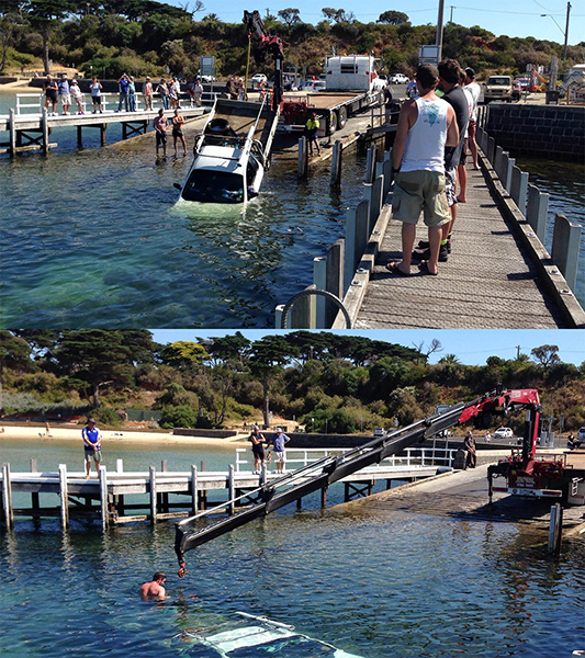 Fassi Recovery Crane in AustraliaFriday, January 31st. At the pier of the port of Mornington, in the Melbourne area, a vehicle fitted with Fassi crane F365A.2.25 owned by the society "Hiway crane Trucks Owners Colin Orchard and Delene Remnant" has been engaged in the recovery of a car finished into the ocean.