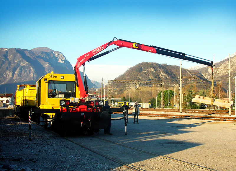 Fassi-F95A-0-23-on-railocDecember 2013 - Gemona station, 35 km north of Udine (Friuli Venezia Giulia). The Railoc factory placed at Ovada (Alessandria) gave "putting on rails" an railway cart "autocarrello" SKL 26 for the maintenance of railway lines. The Fassi cranes, F95A.0.23 active has been provided to the operational headquarters of Railoc (Trasaghi-UD) by Friulgru of Vicedomini Renato & Vidoni Massimo snc.