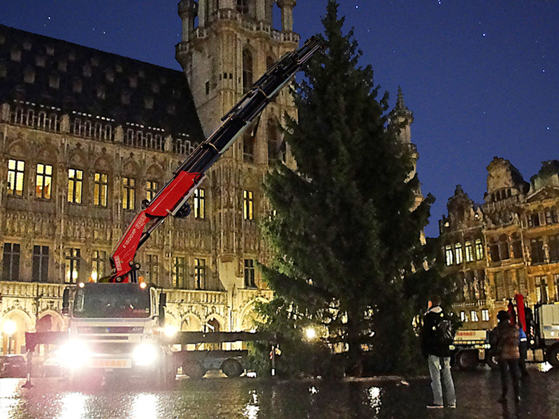 fassi-loader-crane-lift-tree-in-grand-placeTuesday, November 19th. A Fassi crane of 106 tm lifts up a pine tree of the Ardennes in the Grand-Place in Brussels where there is the town hall of the city, one of the finest examples of public buildings in Europe and one of the greatest masterpieces of Gothic style of Brabant.