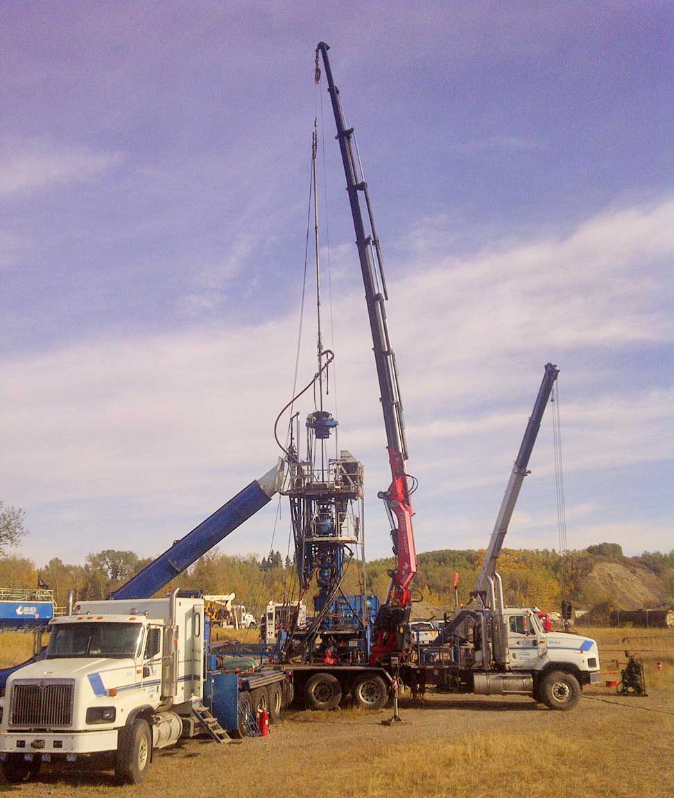 Fassi-in-CanadaAlberta (Canada) - A 80 t/m Fassi knuckle boom crane while is working into Tuner Valley area. The crane is wirelineing through a snubbing unit to complete a gas well. This operational situation is supported by "High Arctic Energy Services". Their comprehensive equipment line-up – including rigs, snubbing units, nitrogen, and specialized equipment rentals – combines with their support services and professionally trained crews to deliver outstanding services in underbalanced drilling, workovers, completions, and more.