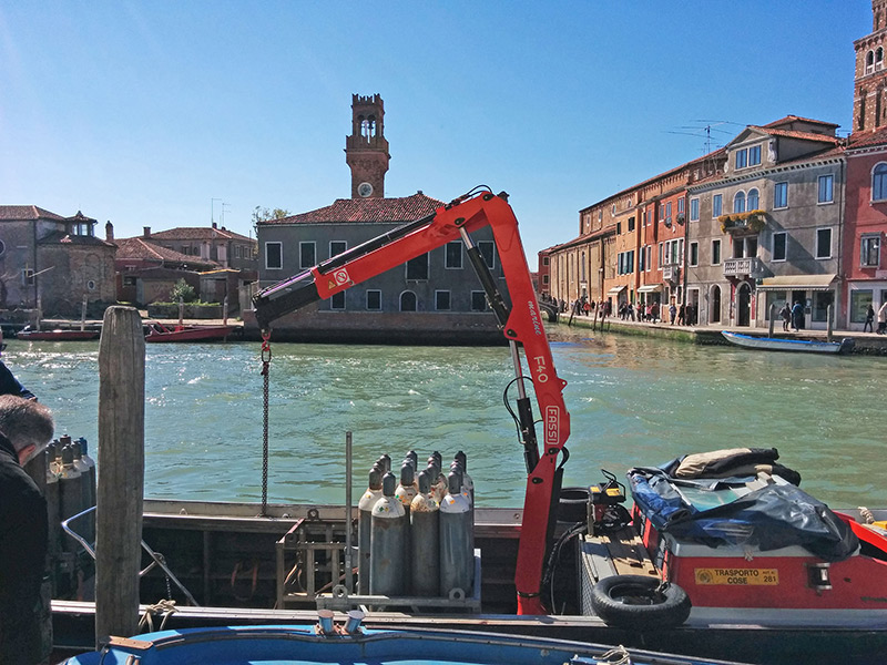 Fassi marina F40A Murano Murano (Venice) - A Fassi crane model F40A.0.22 is preparing to unload the gas cylinders transported thanks to a boat in the canals of Venice. The protective standard defined and proposed by the marine crane Fassi series, is the best solution available today on the market. It is the result of 2 years of long and severe tests carried out in test and development laboratories, during which, the most aggressive work environments were recreated and different protective technologies were tested.