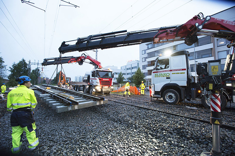 Fassi Tampere Tampere (Finland) - July 2015. Two Fassi heavy-duty loader cranes, belonging of the Finnish company Kurko-Koponen Oy based in Furto and specializing in lifting equipments, have attended at the job shown in the photos to replace railway switch. Courtesy of Grutech Oy (J. Andersson).