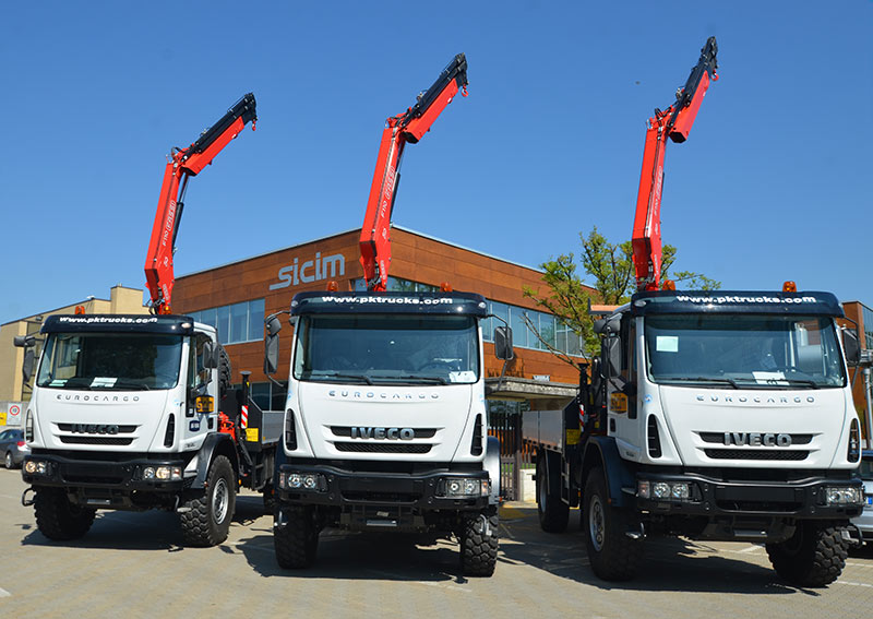 Fassi Sicim gas PeruThe three 4x4 Eurocargo’s featured in the photograph are part of a fleet of 40 similar vehicles for the yard that Sicim is setting up in Peru from which to build a 500 km pipeline. However, not all of the vehicles will be equipped with a rear-mounted crane; they will be distributed across different work teams and equipped according to their different uses. This flatbed version with a Fassi F110B rear-mounted crane is the most versatile as it can be put to numerous uses: in addition to transporting materials, construction tools and raw materials, it can be also fitted with various types of equipment.