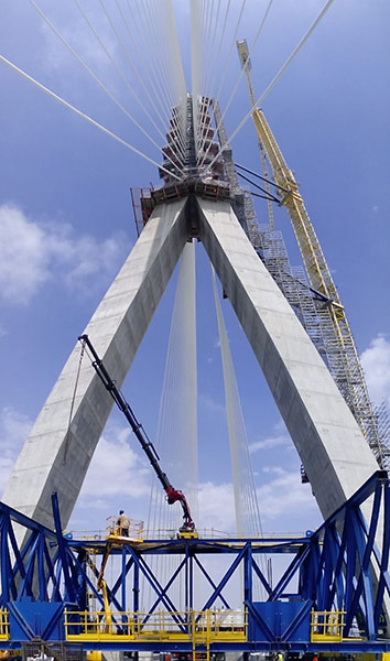 Fassi F1100RA.2.28 Pepa CadiceCadiz (Spain) - July 2015. The bridge of the "Pepa" (in Spanish Puente de La Pepa), the second bridge in Cadiz and new entrance to the city, crosses the gulf with the same name to connect to the Puerto Real in the Spain mainland. This is the longest bridge of Spain, its supporting pillars measure 180 meters in heigh. The project is nearing completion. Four Fassi cranes model F1100RA.2.28 he-dynamic were involved in the construction of the bridge.