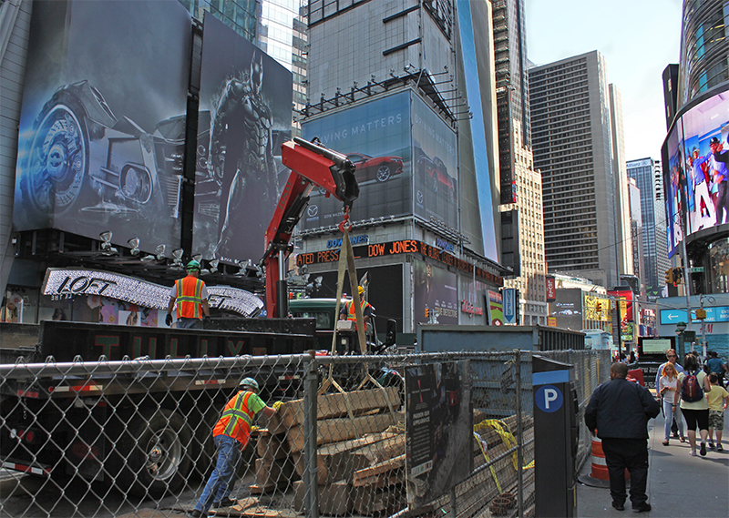 Fassi crane F335A Peterbilt Times Square NYC New York (US) - June 25th, nearby Times Square along the Broadway between the W48th and the W47th. Here works a Peterbilt truck with a Fassi knuckleboom crane model F335A.2.22 (with a lifting capacity of 31,7 t/m and a standard reach of 8,15 m) set up in the rear of the cabin. In the background the huge advertising panel of the last Batman videogame: Arkham Knight. Photo courtesy of F. Locatelli.