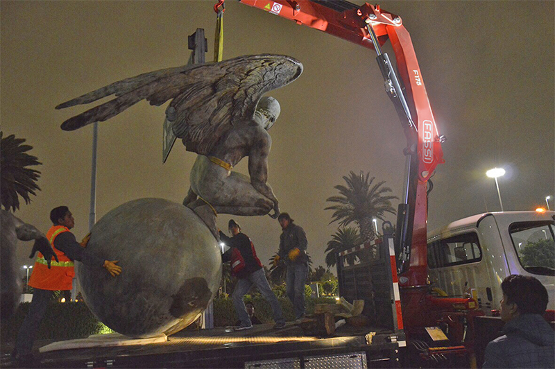 Fassi Terminal 2 MexicoMexico city (Mexico) – A Fassi crane model F175A.0.24 was used to position the monumental sculpture "Perseidi" of Jorge Marin in the square outside the Terminal 2 of the international airport in Mexico city. It’s the biggest monumental artwork of the sculptor and it took him 6 months to produce it. In Marin’s opinion, the aim of this present is to reach public places with artworks.